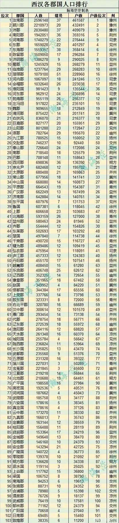 那么在西汉的103个郡国中,各自的人口数量是怎样呢?都说颍川郡和汝南郡出人才,是不是它们的人口也是最多呢?我们就带着这样的问题来了解下西汉各郡国人口。西汉人口最多的郡是汝南郡,人口达到了2596148人,颍川郡和沛郡的人口同样也超过200万人。人口超过200万的三个郡全部来自豫州,要知道豫州有3个郡1个诸侯国,3个郡排在全国前三,由此可见豫州的人口众多,所以颍川郡和汝南郡出人才也就不奇怪了。